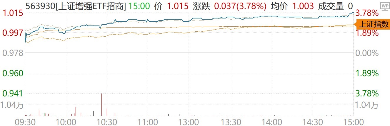 4月8日,受美伊两周临时停火刺激,全球风险偏好迅速回升,A股三大指数高开高走。大盘宽基投资升级之选——上证增强ETF招商(563930)单日收涨3.78%,相对沪指(2.67%)超额明显,专业量化策略力争增强。