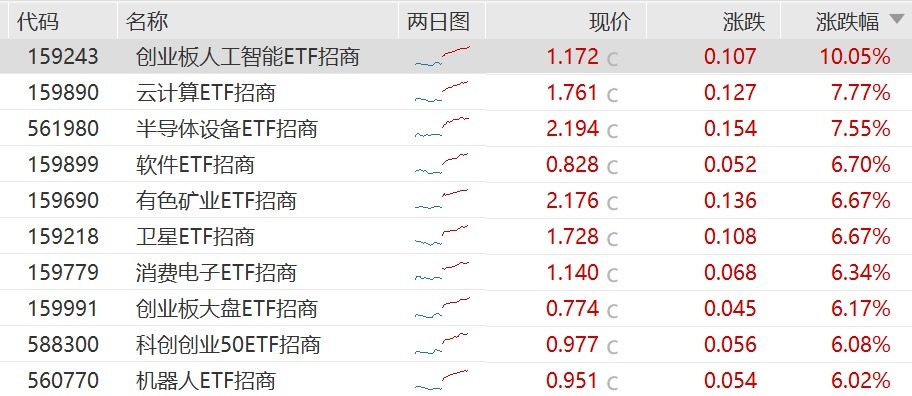盘面来看,半导体、算力/CPO(光模块)、AI应用、卫星、有色金属等迎报复性反弹。创业板人工智能ETF招商(159243)单日飙涨超10%,云计算ETF招商(159890)、半导体设备ETF招商(561980)大涨7.77%、7.55%,软件ETF招商(159899)、卫星ETF招商(159218)、有色矿业ETF招商(159690)等均强势涨超6.6%。